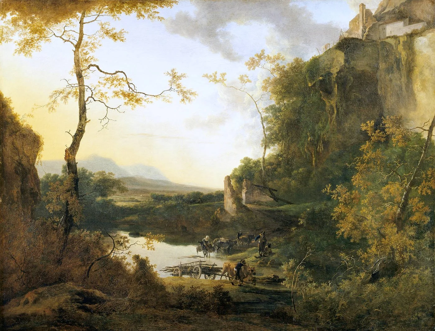 Landscape painting depicting a serene scene with a river, trees, distant mountains, and people tending to horses and a cart by the water.